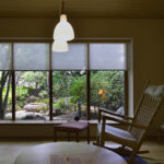 先日の日曜日、職人さんが本社設計室の天井に和紙クロスを貼りに来るとのことで早出出勤しました。細部の納まりなどを打合せた後、西のゲストルームで朝用のお弁当をいただいて小休止。 この日、庭は朝方までの雨でしっとりとした風情、雨霧がついた葉は